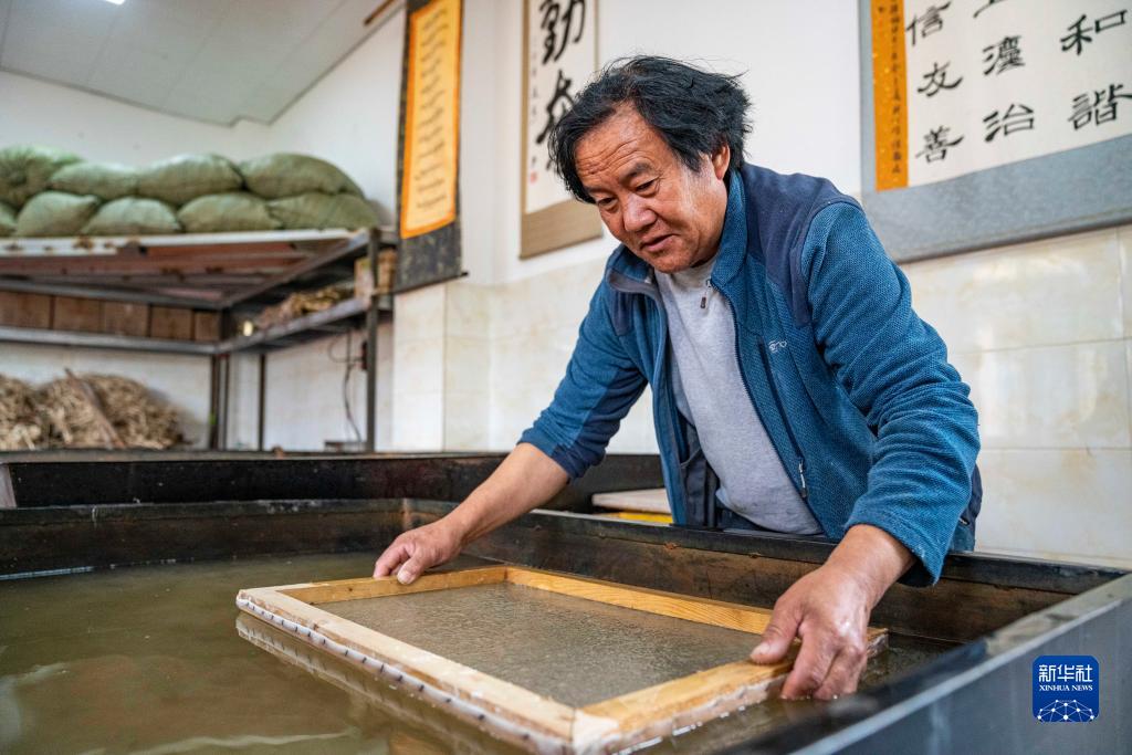 在西藏米林市羌納鄉西嘎門巴村,南迦巴瓦童螺嘎布工藝品農民專業合作社的工作人員正在製作藏紙(7月26日攝)。