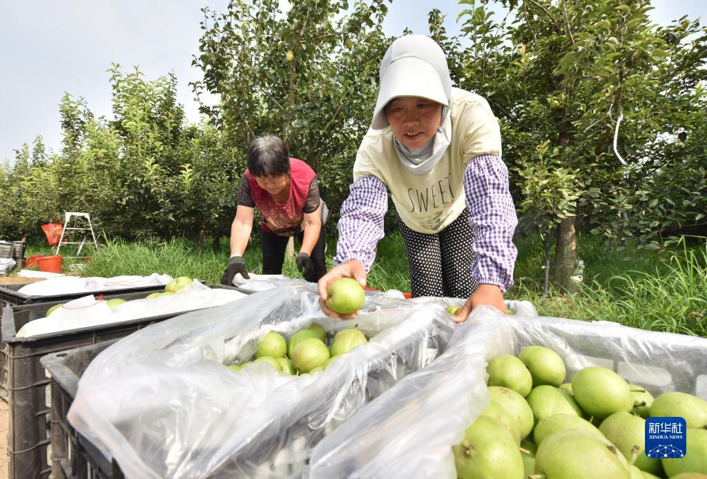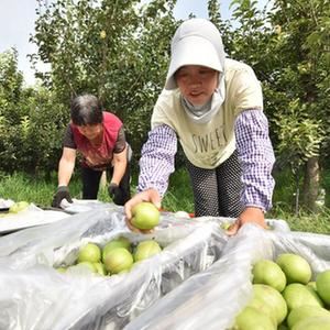 7月27日,河北省威縣張營鄉前花疃村果農在梨園分揀採摘的梨果。