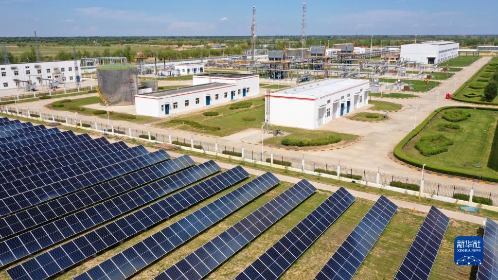 長慶油田第五採氣廠蘇裏格天然氣第六處理廠廠區內的光伏發電站(7月23日攝,無人機照片)。