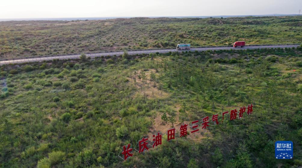 位於烏審旗的長慶油田第三採氣廠防護林(7月26日攝,無人機照片)。