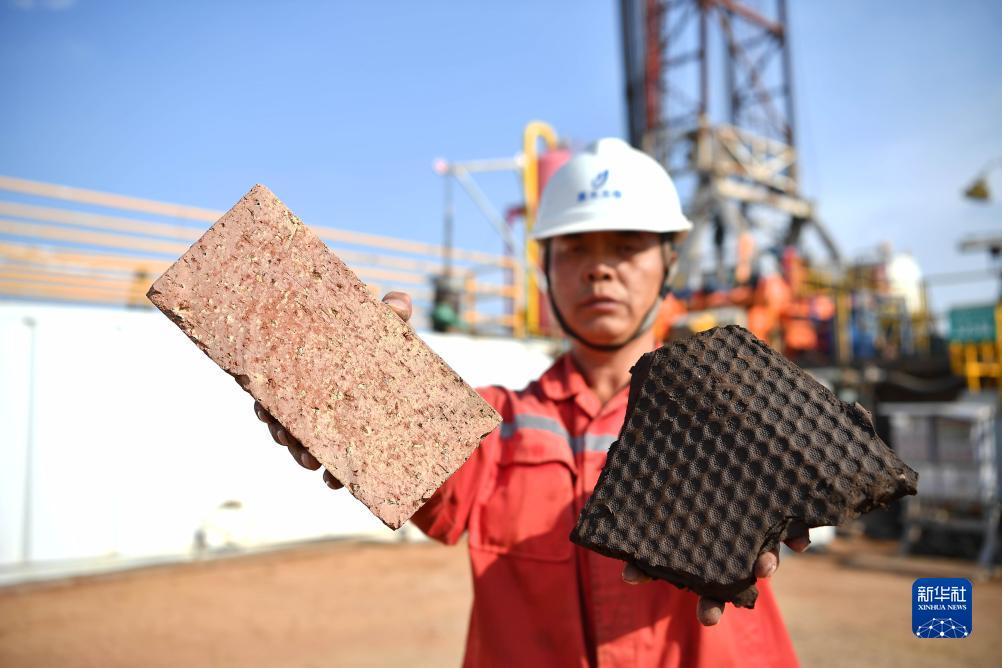 7月26日,在長慶油田蘇裏格氣田一處鑽井平台旁,技術人員在展示由鑽井岩屑製成的濾餅和“環保磚”。