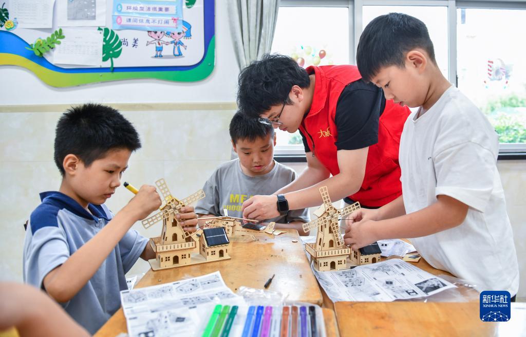 7月27日,在余姚市舜北小學暑托班內,志願者和孩子們一起製作太陽能科學實驗裝置。