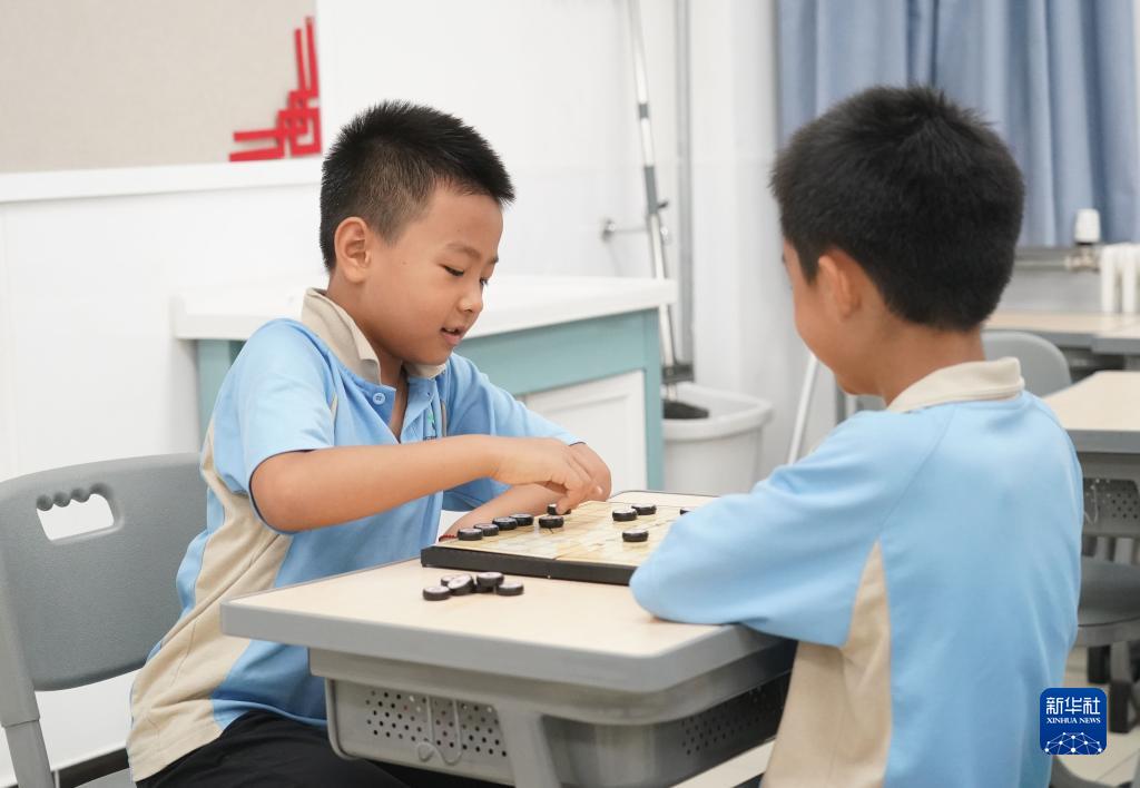 7月27日,在人大附中實驗小學,參加暑期託管班的學生在下象棋。
