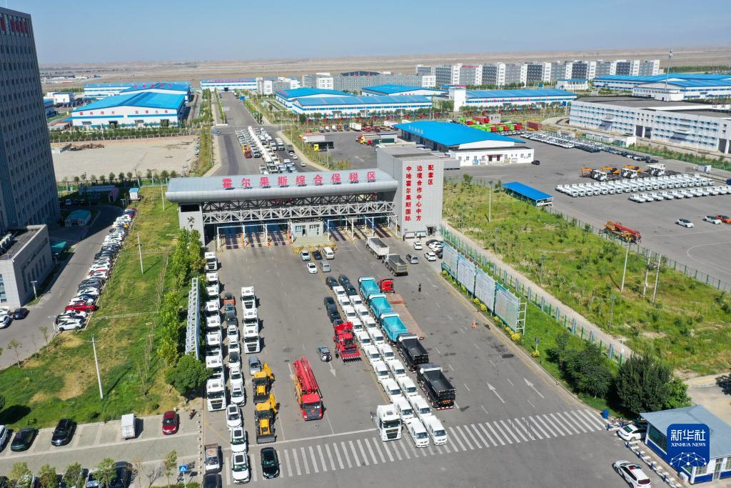 在新疆霍爾果斯綜合保稅區,國産商品車等待報關出境(7月26日攝,無人機照片)。