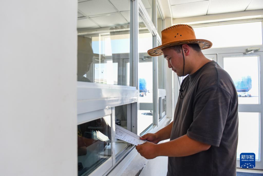 在新疆霍爾果斯海關車輛進出境查驗場,國産商品車出口企業工作人員遞交出境申報單(7月26日攝)。