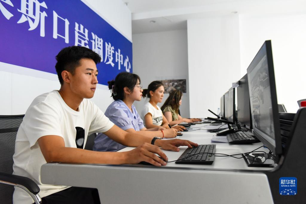 在新疆霍爾果斯口岸調度中心,工作人員通過監控調度出口車輛(7月26日攝)。