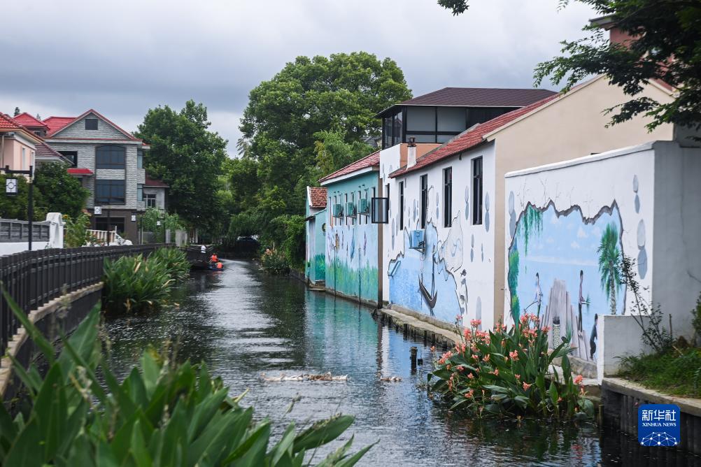 清澈的河道與精緻的墻繪構成了嘉興市南湖區新豐鎮竹林村的美麗鄉村新畫卷(7月27日攝)。