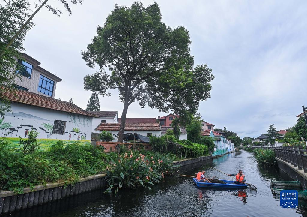 7月27日,保潔人員乘船在竹林村的河道中打撈漂浮物。