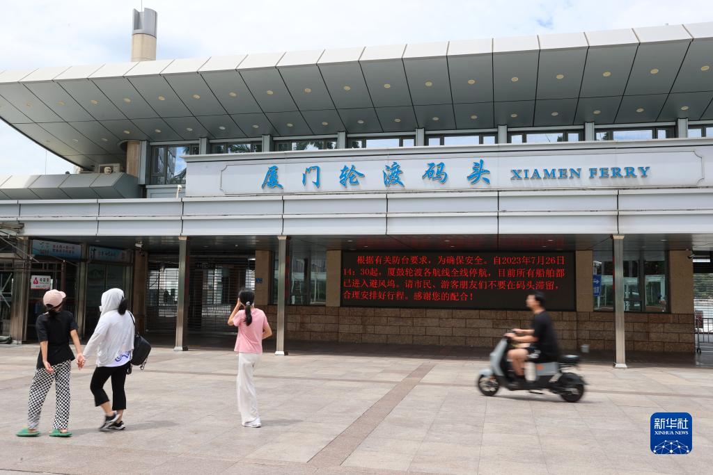 福建廈門輪渡碼頭電子顯示屏向游客提示受颱風影響有關停航的信息(7月27日攝)。
