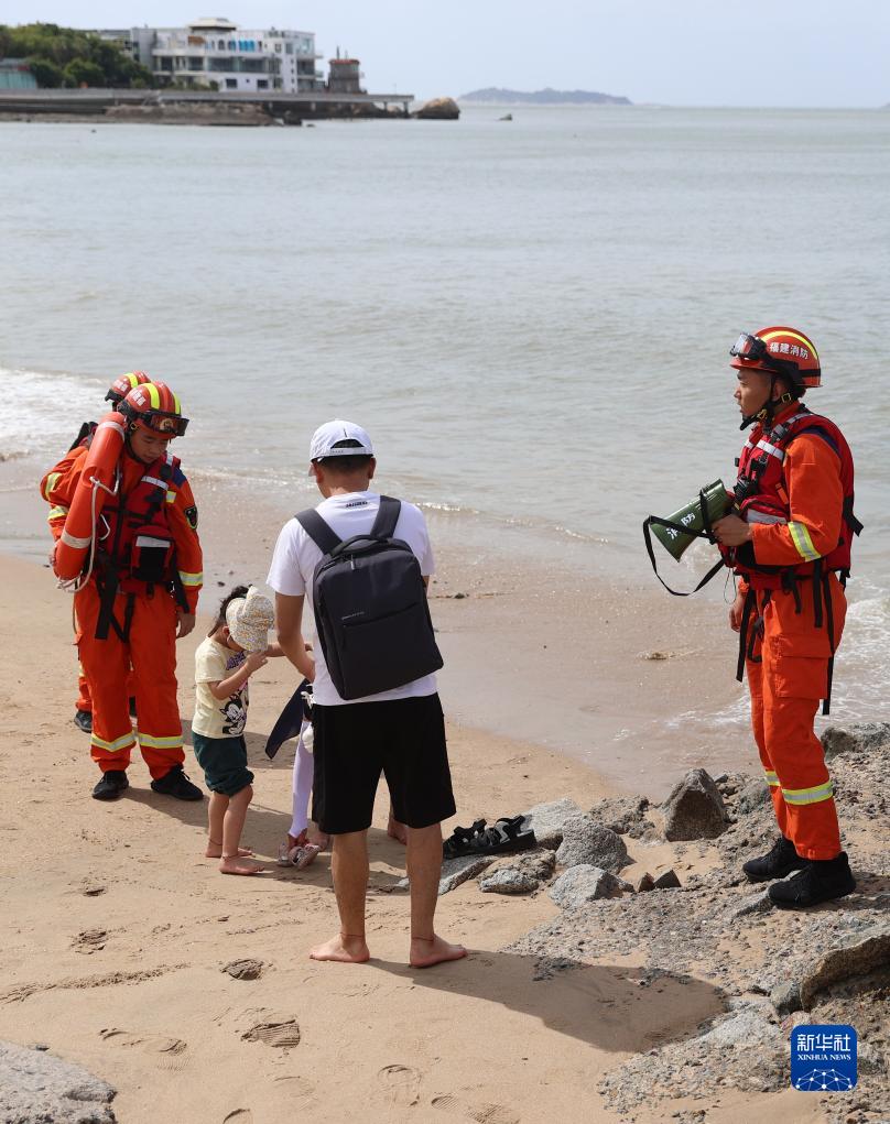 7月27日,福建省廈門市思明區廈港消防救援站消防員在廈門環島路海邊對游客進行勸離。