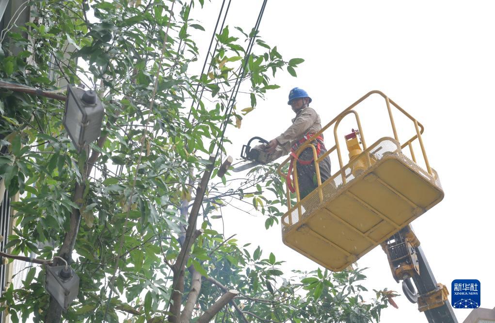 7月27日,國網漳浦縣供電公司員工在漳浦縣青年路修剪樹枝,防止颱風天氣樹枝觸碰電力設施導致線路跳閘。
