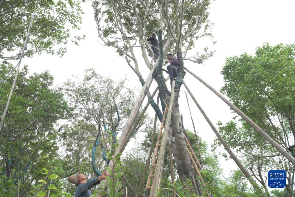 7月27日,漳浦縣長橋鎮友愛村旺山園林有限公司工人在加固大型苗木。