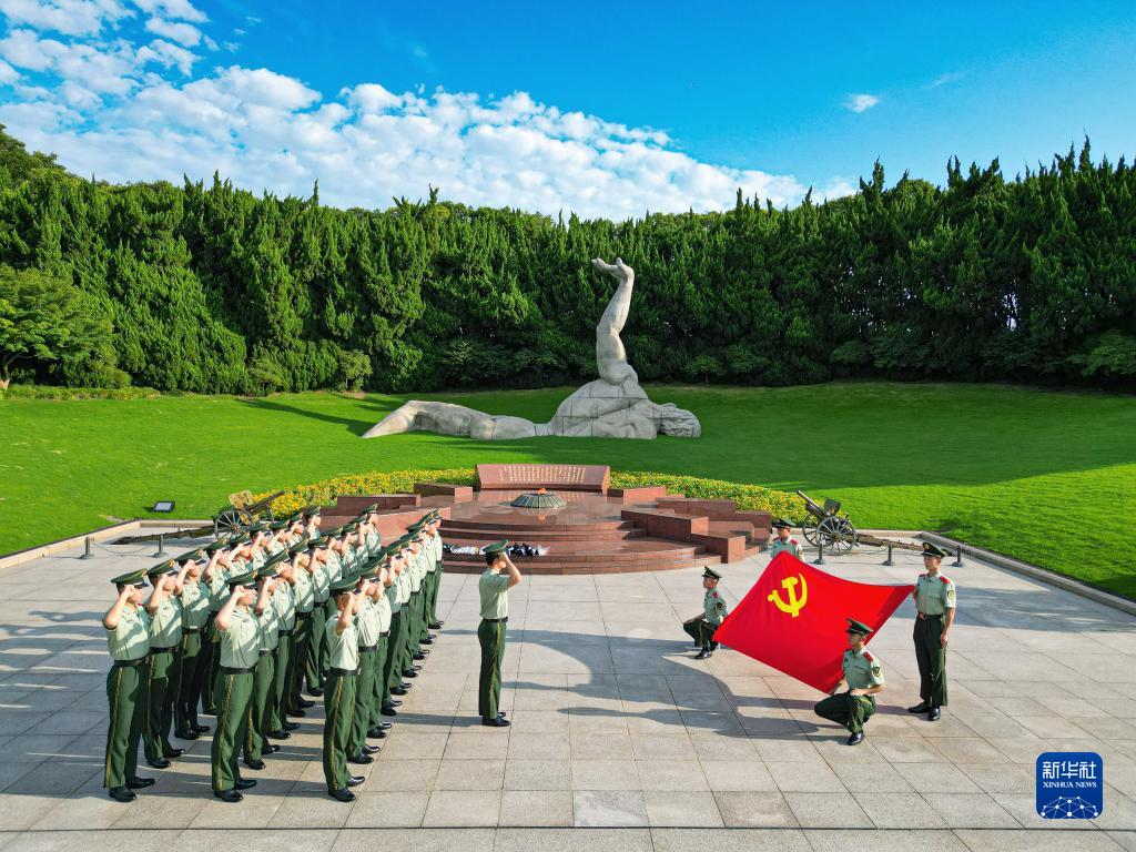 武警上海總隊機動第一支隊“天德山英雄連”官兵在上海龍華烈士陵園無名烈士紀念碑前重溫入黨誓詞,緬懷先烈、銘記歷史(7月25日攝)。
