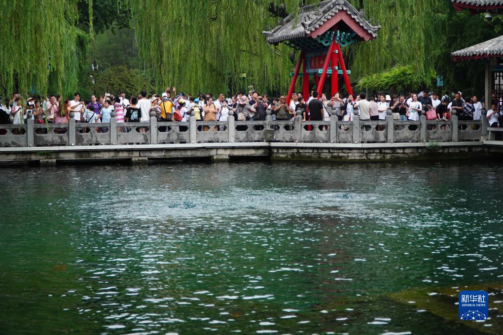 游客在山東省濟南市觀賞趵突泉,趵突泉是濟南市泉城水利工程的一部分(7月21日攝)。