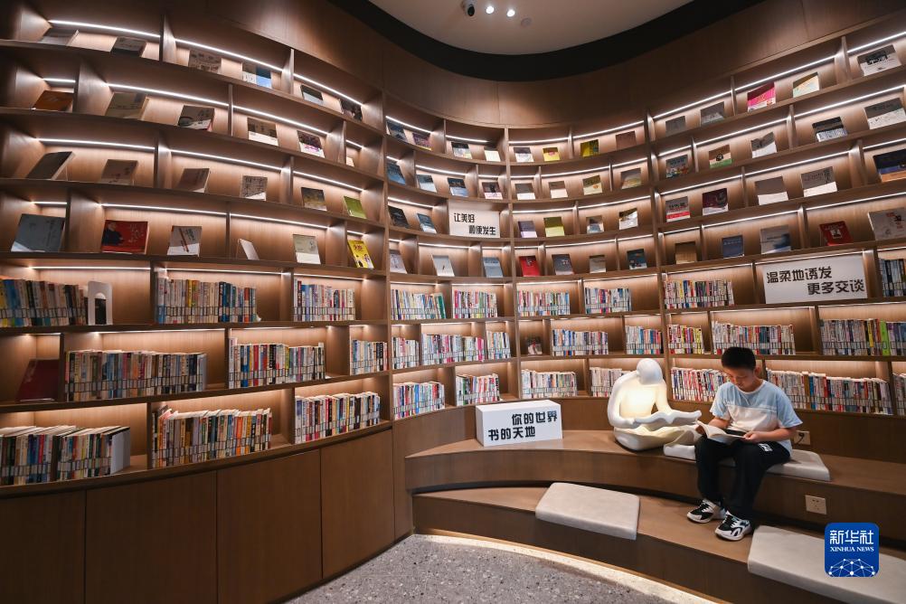 7月27日,兒童在嘉興市南湖區余新鎮漁裏未來社區“向日葵親子小屋”的天空書城裏看書。