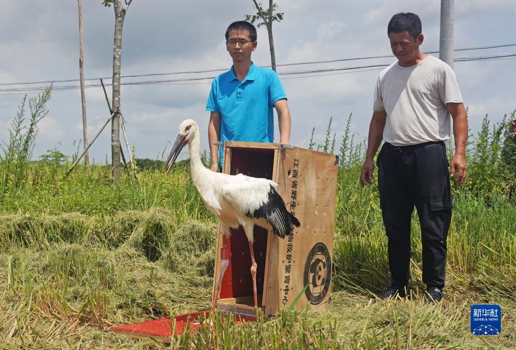在江西省進賢縣鐘陵鄉,工作人員將江西省野生動物救護中心救治康復後的東方白鸛放歸自然(7月20日攝)。