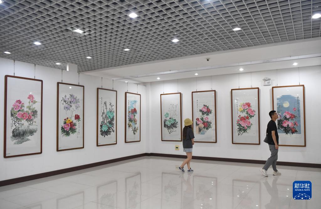 7月26日,來訪者在平樂社區的牡丹畫創意産業園區展廳內觀賞牡丹畫。
