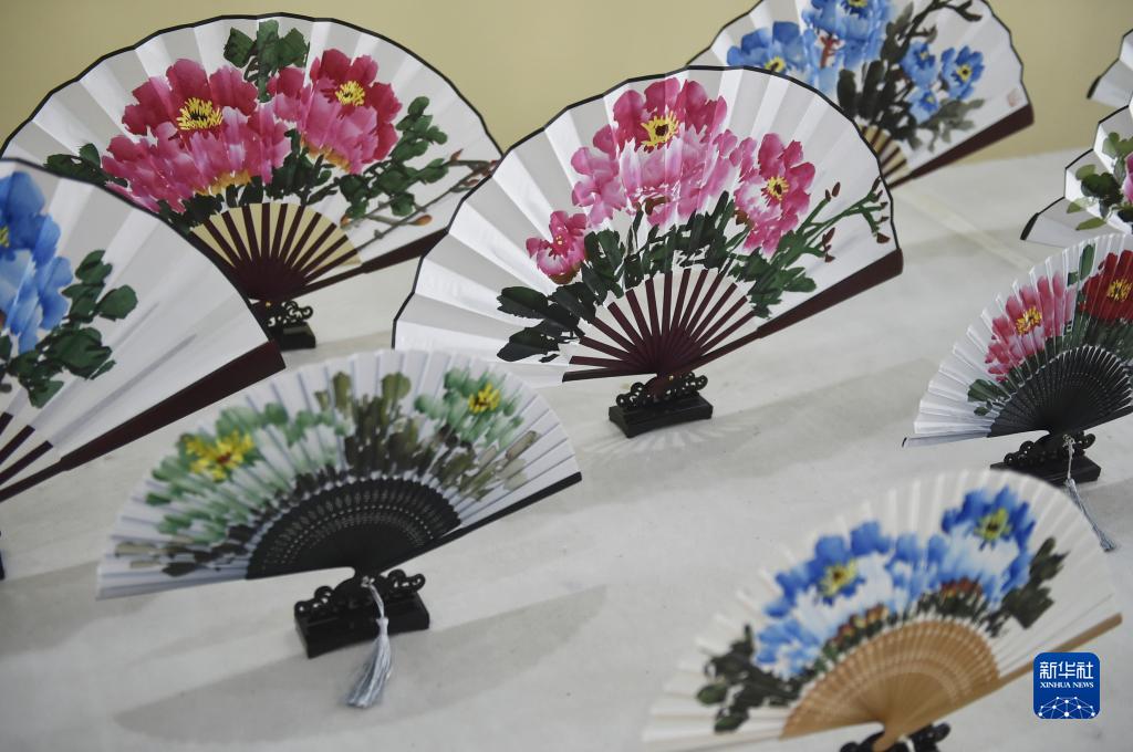這是7月26日在平樂社區的牡丹畫創意産業園區展廳內拍攝的牡丹畫扇面作品。