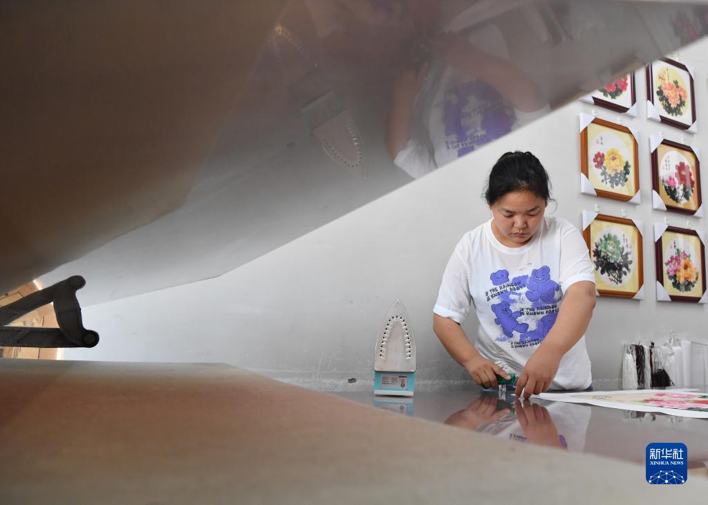 7月26日,工作人員在平樂社區的牡丹畫創意産業園區工作室內裝裱牡丹畫。