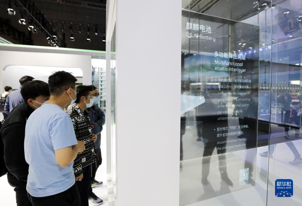 2023年4月24日,在第二十屆上海車展上,參觀者在寧德時代麒麟電池展示模型前交流討論。