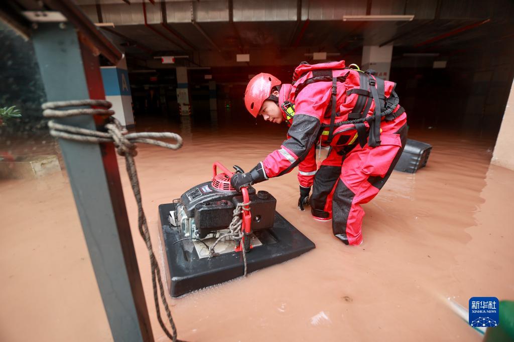 7月28日,重慶大渡口區天安數碼城地下車庫內,救援人員利用消防浮艇泵、手&機動泵等器材抽取積水。