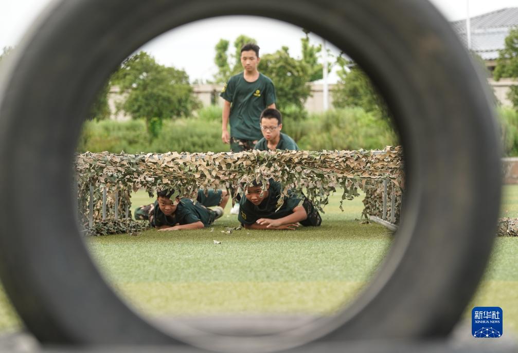 參加軍事特訓營的小朋友在進行軍事拓展訓練(7月26日攝)。