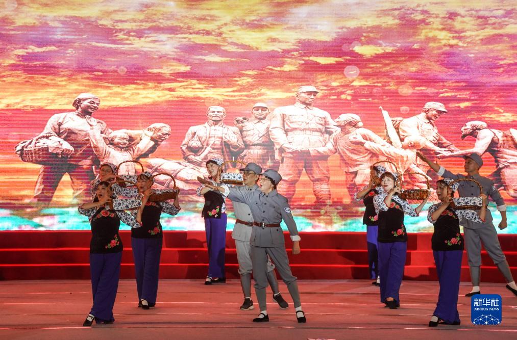 老戰士後代組成的文工團在國防園慶祝八一建軍節演出中表演《黃橋燒餅歌》(7月26日攝)。