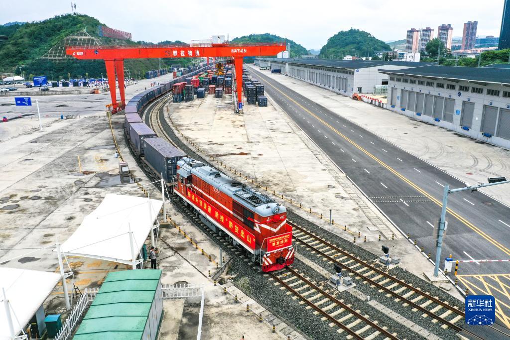 當日,貴陽國際陸港直達中亞班列正式開通。據悉,該班列全程採用集裝箱“公路—鐵路—公路”的國際多式聯運方式,經貴陽綜合保稅區報關,從貴陽都拉營站(貴陽國際陸港)裝車出發,經新疆霍爾果斯口岸出境至哈薩克斯坦(阿拉木圖)熱特蘇站,單程在途時間約11天。運抵之後,返程將從哈薩克斯坦向貴陽運輸1300噸農産品。