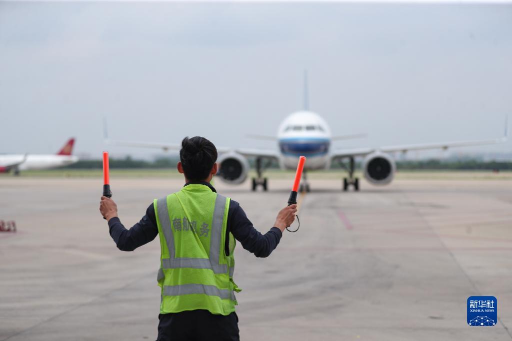 7月28日,南航工程技術分公司瀋陽基地的機務人員在引導飛機。