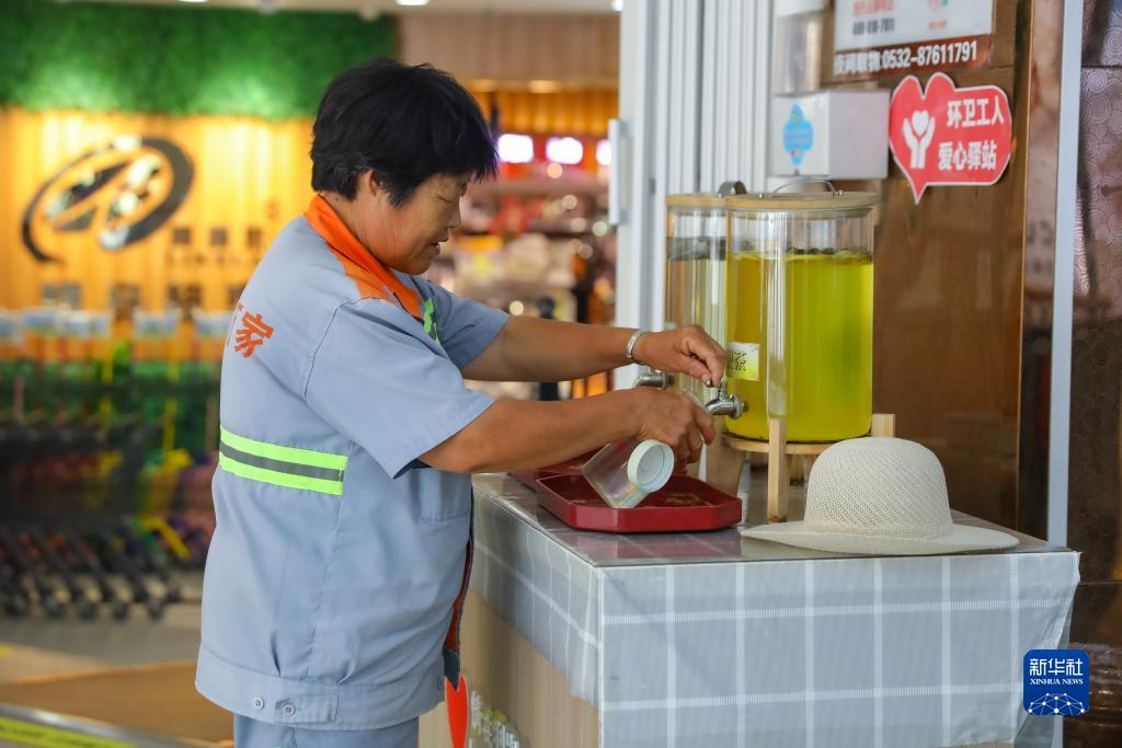 7月27日,在山東省青島市李滄區一家商場內,環衛工人接取免費的茶飲消暑止渴。