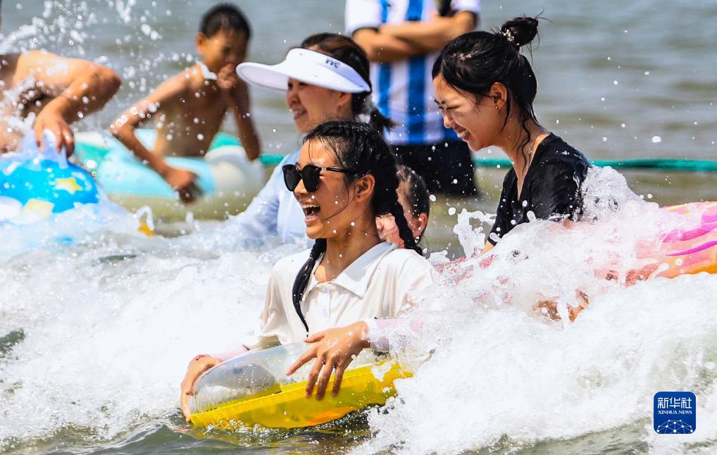 7月23日,游客在山東省威海市國際海水浴場戲水納涼。