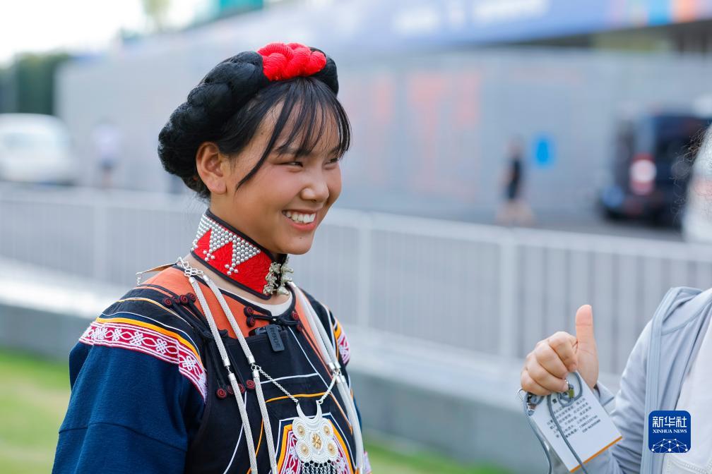 7月23日,在成都大運會開幕式綵排之前,老師向吉好有果豎起大拇指鼓勵她。新華社記者 沈伯韓 攝