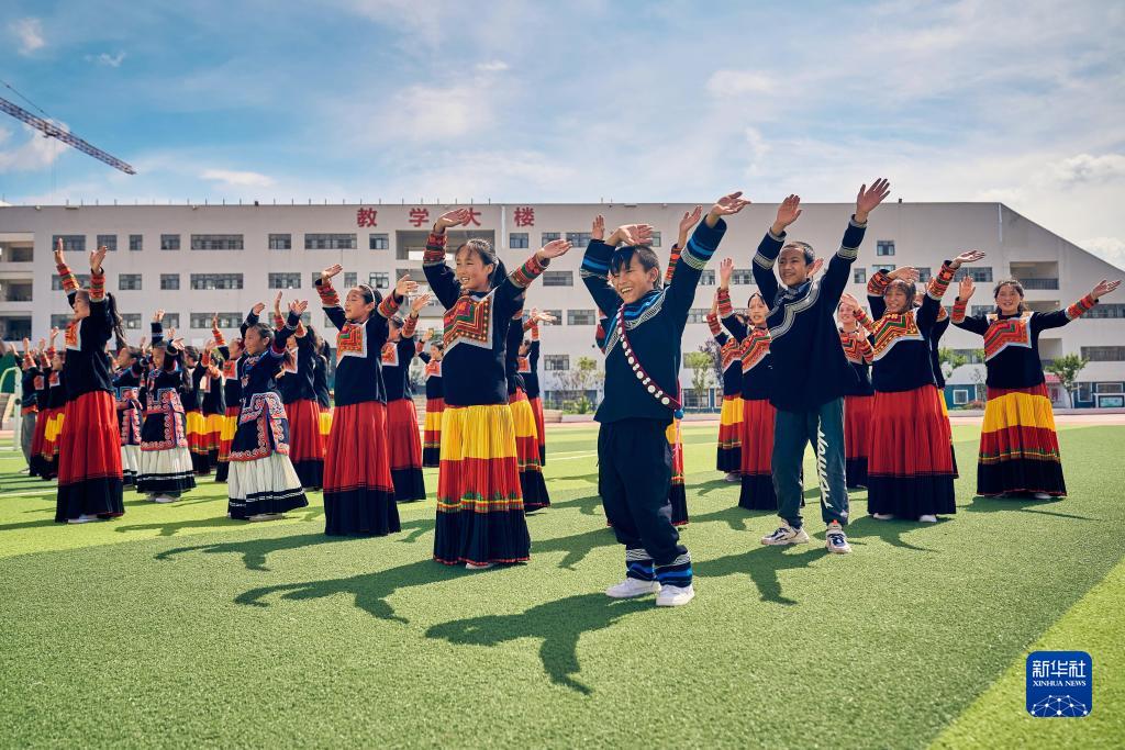 7月2日,吉朵史拉(前右四)在昭覺縣萬達融創紅絲帶愛心學校參與排練。新華社發(受訪者供圖)