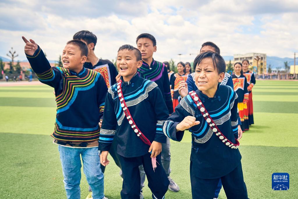 7月2日,吉子醫生(前中)和吉朵史拉(前右)在昭覺縣萬達融創紅絲帶愛心學校參與排練。新華社發(受訪者供圖)
