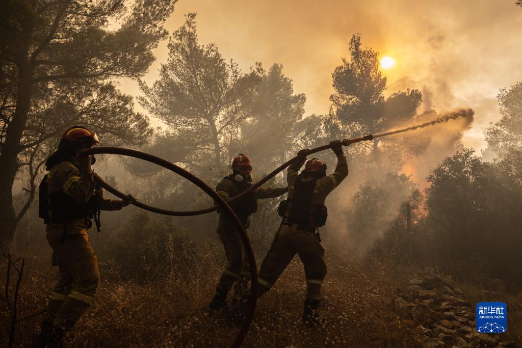 7月20日,在希臘雅典西郊的聖索蒂拉,消防員進行滅火作業。