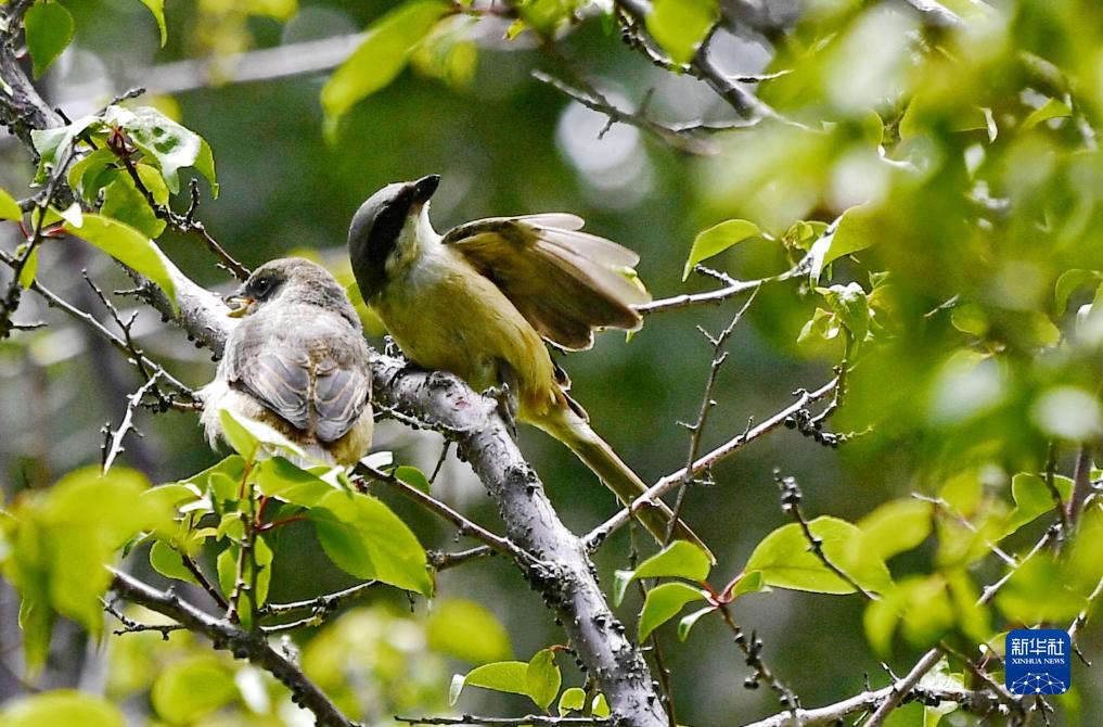 一隻伯勞(右)和幼鳥在拉薩市城關區一處庭院的樹枝上(7月28日攝)。