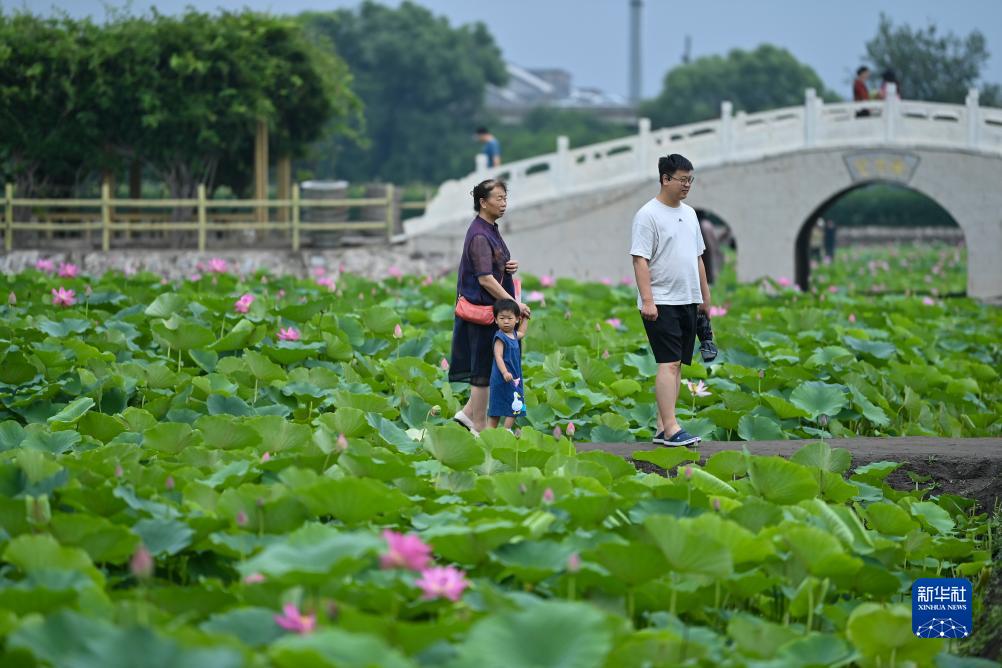 夏日,山西省太原市晉源區北大寺村的荷花競相開放,吸引眾多游客前來觀賞。