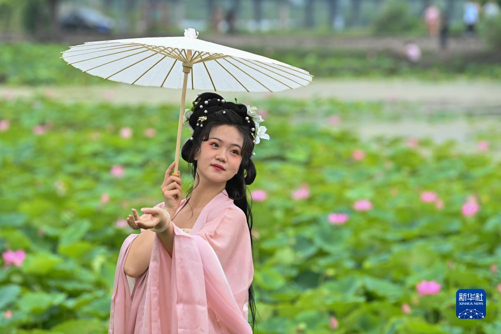 夏日,山西省太原市晉源區北大寺村的荷花競相開放,吸引眾多游客前來觀賞。