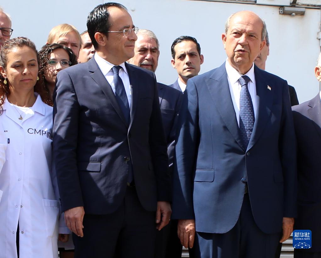 7月28日,塞浦路斯希臘族領導人、總統赫裏斯托祖利季斯(前中)和土耳其族領導人塔塔爾(前右)走訪位於塞首都尼科西亞的聯合國緩衝區內的塞浦路斯失蹤人員委員會。