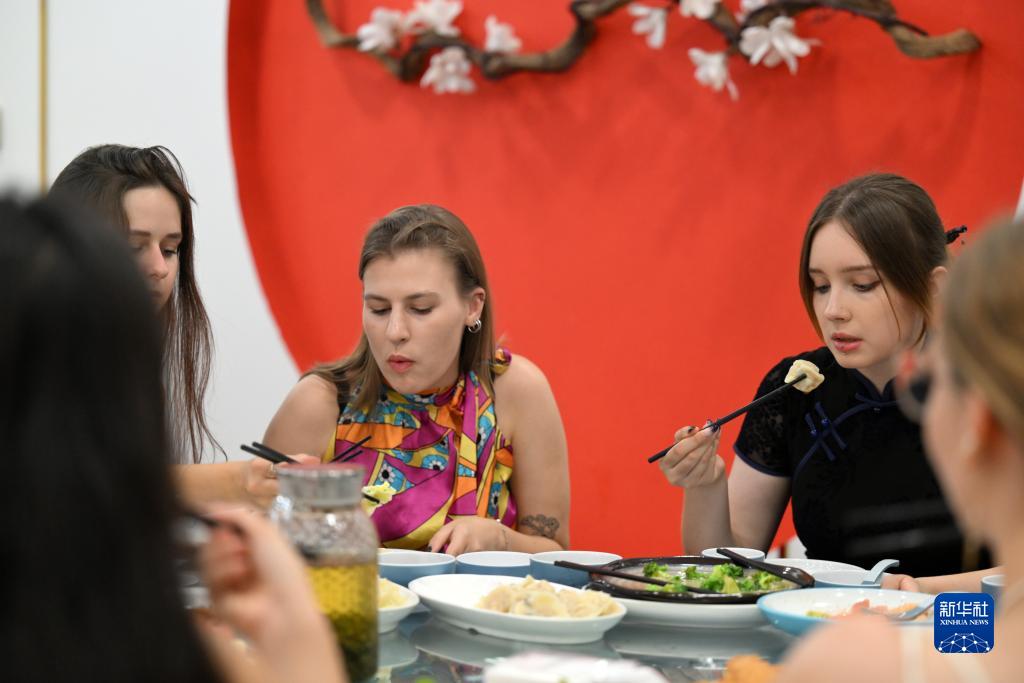 7月29日,參加夏令營的來華學生在餐廳品嘗餃子。
