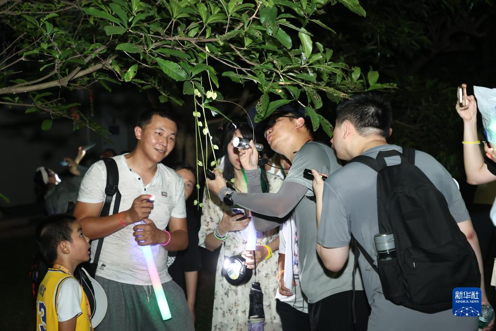 7月28日,粵港澳三地青少年在老師的指導下夜游植物園,了解植物奧秘、尋訪夜行性昆蟲。