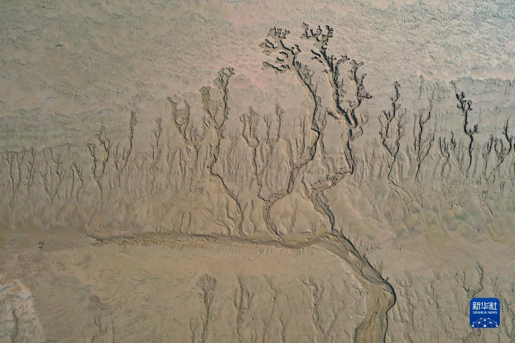 近日,隨着黃河調水調沙結束,黃河河南省開封市黑崗口險工段水位下降。河床被水流沖刷過後呈現出縱橫交錯的“脈絡”。