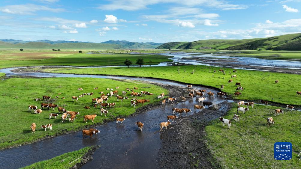 烏蘭毛都草原上的牛群(無人機照片,7月24日攝)。