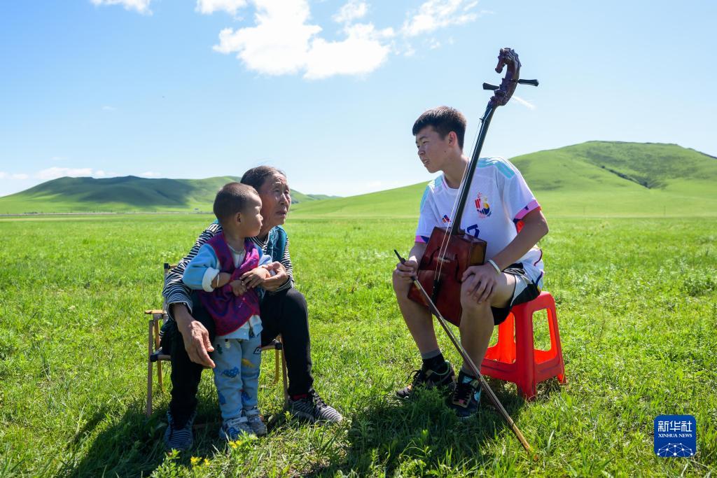 7月24日,吳蘇日力格(右)在練習馬頭琴間隙與家人聊天。