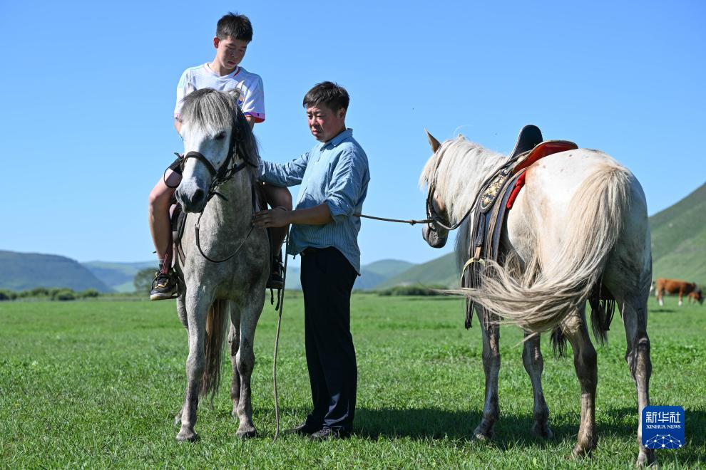 7月25日,吳蘇道(右)在草場上為吳蘇日力格調整馬鞍。
