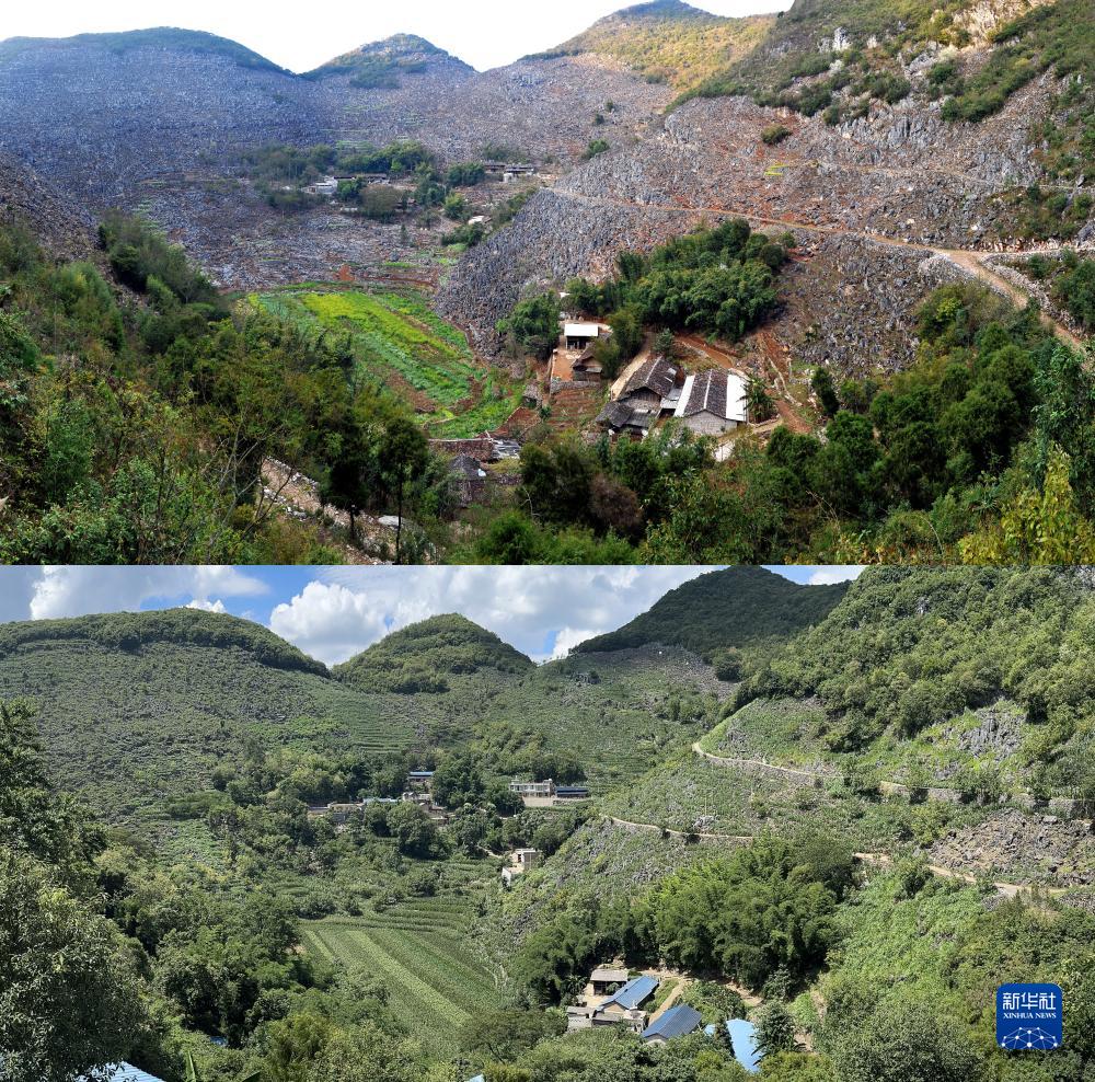 這是一張拼版照片:上圖為1991年拍攝的西疇縣大鄔麻村改造前的石漠化情況(西疇縣融媒體中心供圖);下圖為2023年7月26日拍攝的西疇縣大鄔麻村改造後的情況(新華社記者費茂華攝)。新華社發