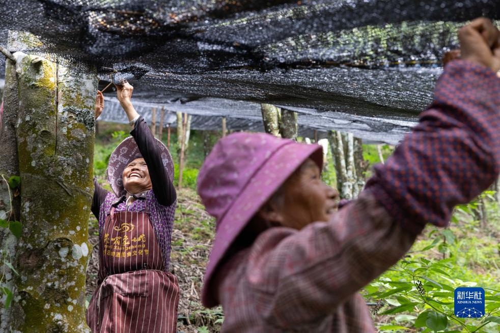 7月27日,工作人員在雲南西疇縣西灑鎮的中藥材基地修補遮陽網。新華社記者 呂帥 攝