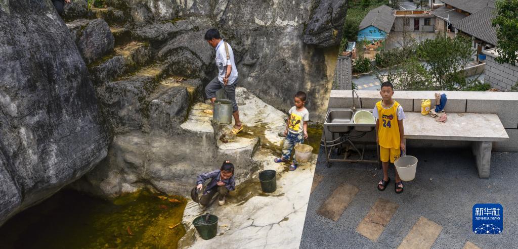 這是一張拼版照片:左圖為2014年拍攝的西疇縣岩頭村村民在石頭凹裏取水,這些水是下雨時積的,當時小村民李大鑫(右)只有5歲(西疇縣融媒體中心供圖);右圖為2023年7月26日拍攝的西疇縣岩頭村村民李大鑫在自己家的院子裏接自來水(新華社記者費茂華攝)。新華社發