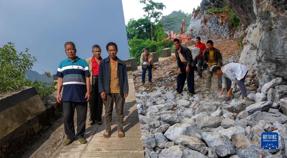 這是一張拼版照片:右圖為2013年李華明(左一)和岩頭村村民楊運富(中)、李光才(右二)一起修路的資料照片(西疇縣融媒體中心供圖,陳明凱攝);左圖為2023年7月26日李華明(左)、楊運富(中)和李光才一起在他們修好的出村路上合影(新華社記者費茂華攝)。新華社發
