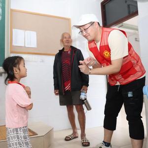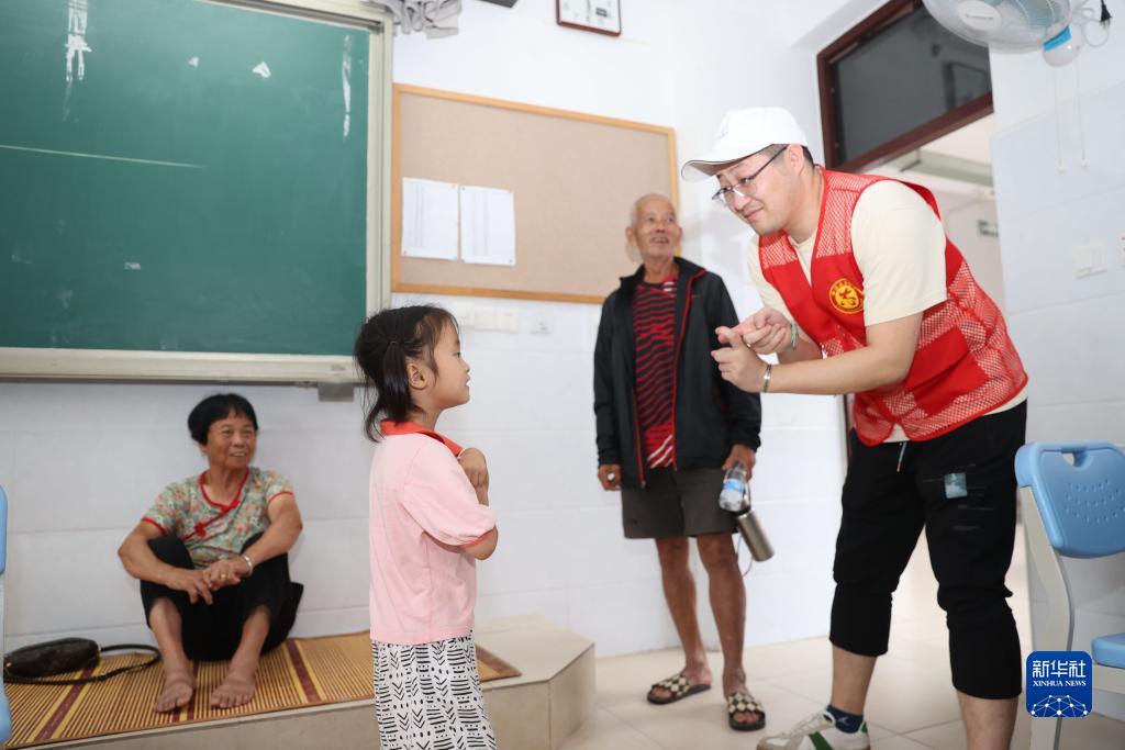 7月29日,在福建省廈門市新圩學校臨時安置點,志願者與被轉移安置的小朋友互動。